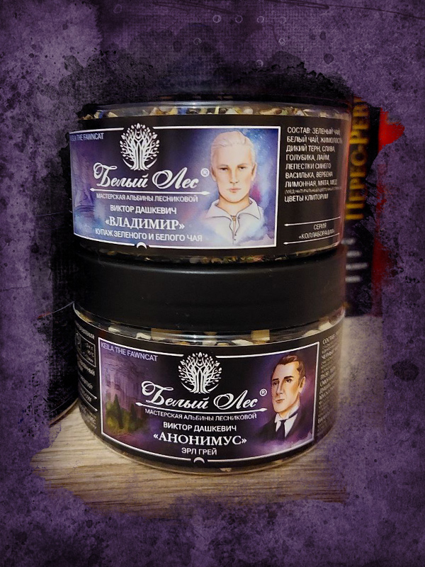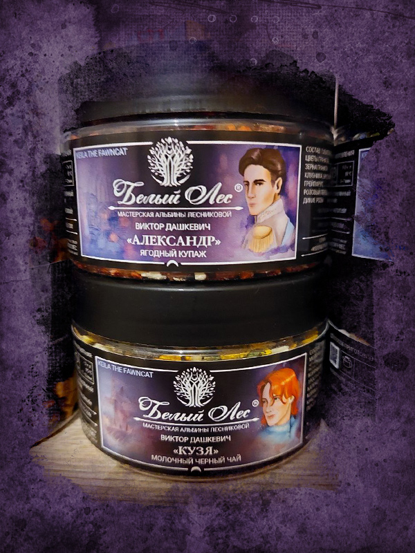 Поговорим о чае )) Тут хватит поста на четыре - правда не слов, а картинок )) Год у меня начался с дегустации купажей от мастерской "Белый лес", посвящённых ещё четырём персонажам "Колдуна Российской империи". Как и для "Гермеса Аверина", выпущенного осенью, рисовала иллюстрации для баночек и выбирала из нескольких вкусов те самые, которые лучше всего подходили бы любимым дивам. Столько чая со всякими интересными добавками я не пила примерно никогда )) Несколько сортов перца, шишки, кора кедровых орешков, ароматные кристаллы сахара, цветы календулы и клитории, дающей совершенно инопланетный бирюзовый цвет - этой зимой было всё и даже больше )) Оказалось очень вкусно и увлекательно ♥ Альбина настоящая волшебница! С портретами, как мне кажется, тоже получилось достаточно симпатично - учитывая мой минимальный опыт в рисовании людей )) И рисовании вообще, чего уж там... Теперь хотя бы не боюсь за такое браться - вон даже на фигурки по "Безсонову" хочу замахнуться )) А ещё сбыла свой коварный план взять референсом для Змейсы Бэзила Рэтбоуна - свой дримкаст Анонимуса *люблю умею практикую*